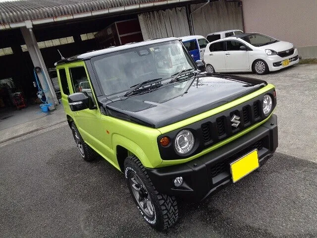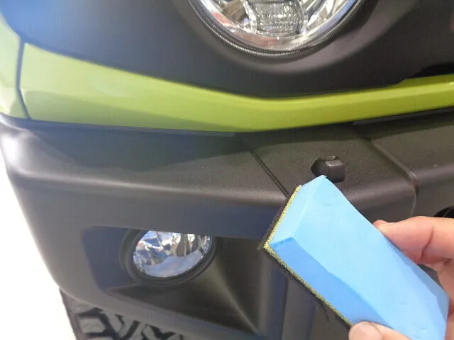 ジムニーはバンパ等黒いプラスチック素地が多くここも保護する為に施工します。経年劣化で白ボケするのを防ぎます。